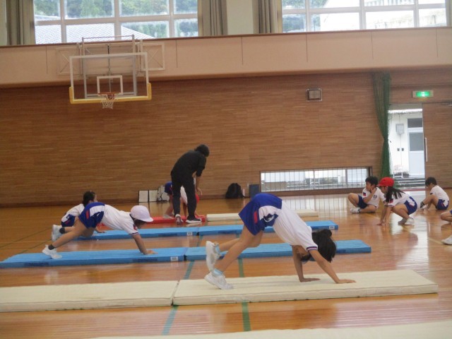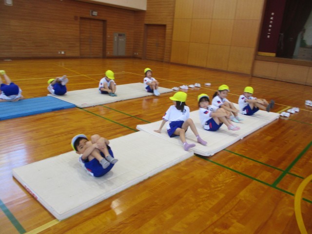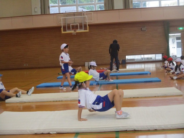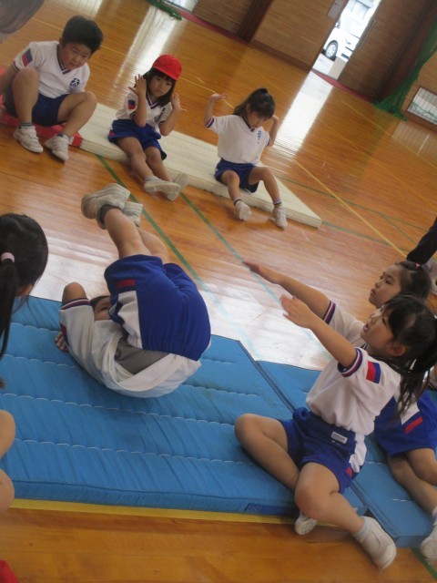 すべて前転、後転につながる大切な動きです。難易度が少しずつ上がっても、次々に挑戦しようとするパワーと、友達と楽しみながら運動する姿がとてもすてきでした! 教わったことを、学校でも続けていきましょう。