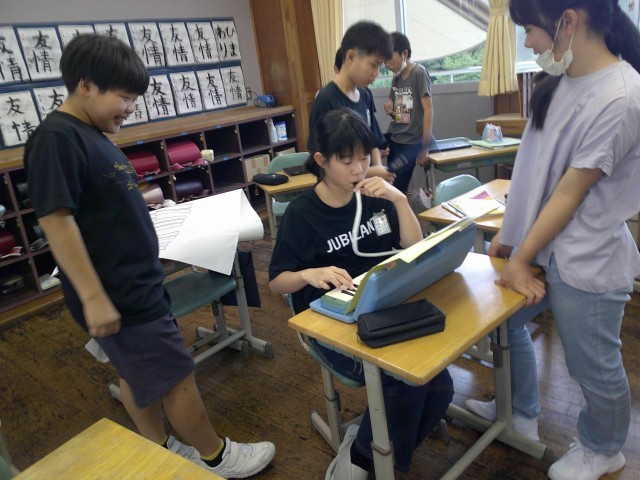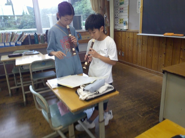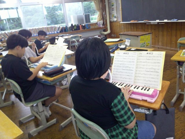 先日、音楽発表会で合奏する際の担当の楽器が決まりました。楽譜をもらった子供たちは、同じ楽器を担当する友達と熱心に練習しています。