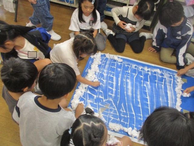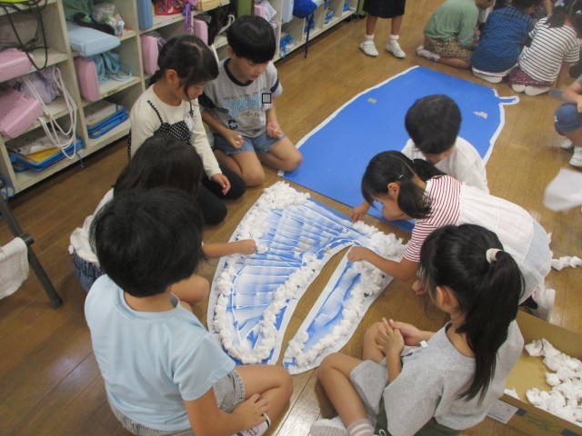 こちらは、音楽劇「くじらぐも」で登場するくじらぐもを制作している様子です。みんなで協力しながら、花紙を丸めたり、つけたりしています。