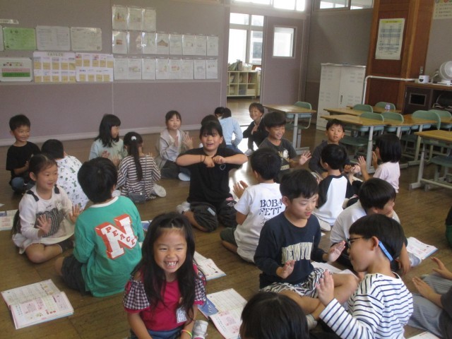 ペアの人と手拍子をしたり、カードに合わせて手を動かしたりして歌ったり体を動かしたりしました。