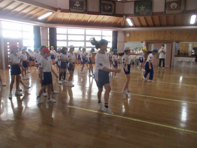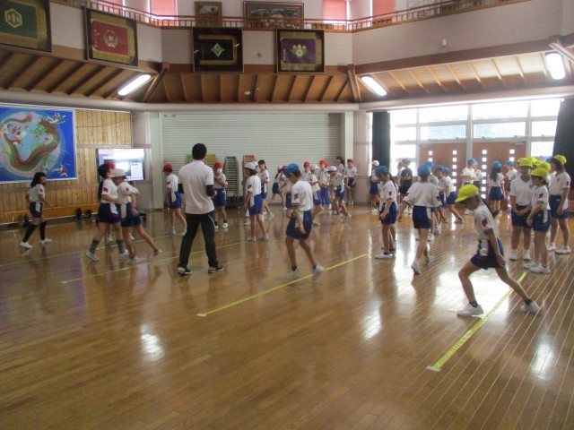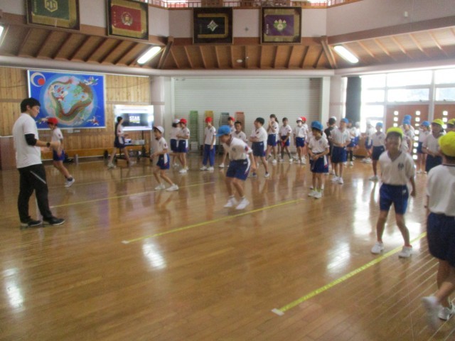 音楽に合わせて体を動かしました。ラインを踏まないように気を付けて、両足でジャンプしたり、クロスしたりするなど、リズムに合わせてさまざまな動きに挑戦しました。
