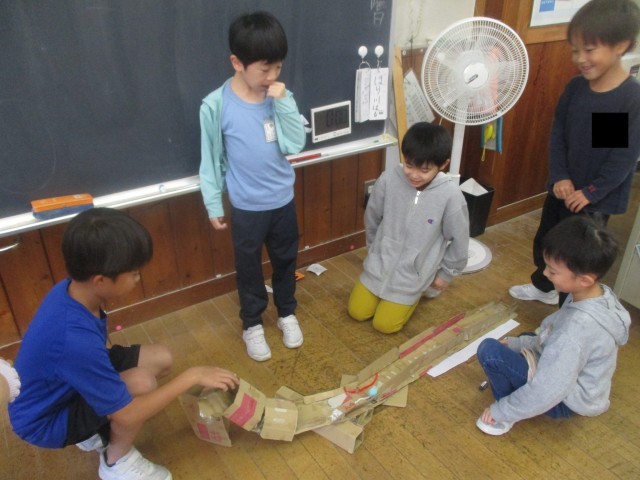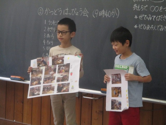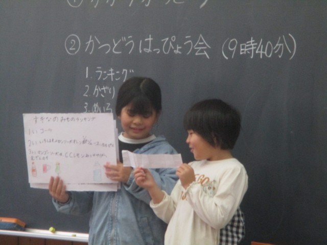 クラスの友達に調査したアンケート結果を発表したり、段ボールでつくった迷路を披露したりしました。