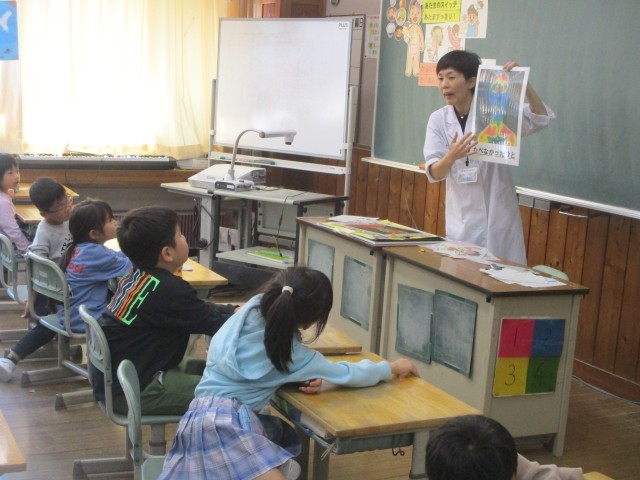 栄養教諭の先生と、朝ごはんの働きについて学習しました。