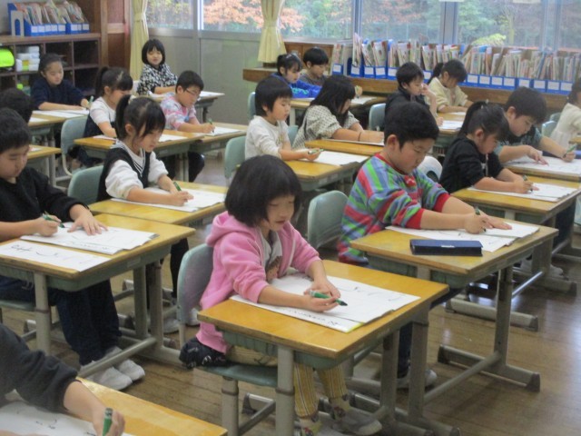 初めて硬筆墨をもち、「こうま」という文字を書きました。手本をよく見て、一画一画丁寧に書きました。
