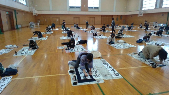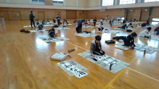 書初大会を行いました。 課題は「平和な海」です。いつもは賑やかな体育館ですが、今日は驚くほどの静寂が広がっていました。一人一人がお手本をじっくりと見つめ、集中して筆を運ぶ姿が非常に印象的でした。