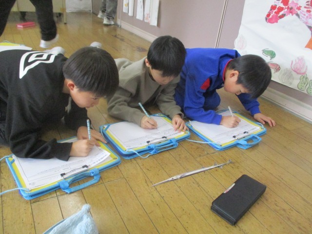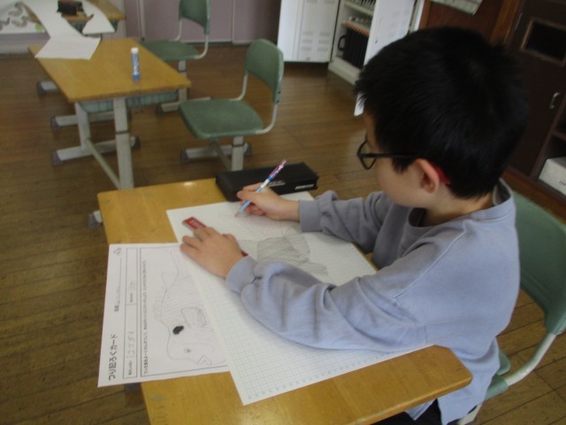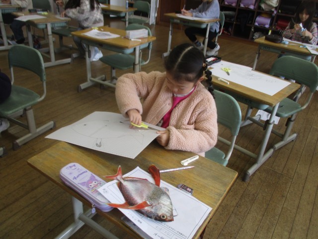 「ヒレにも模様があるね」「この魚はギザギザのヒレだよ」などと、気付いたことを友達と話しながらスケッチしました。