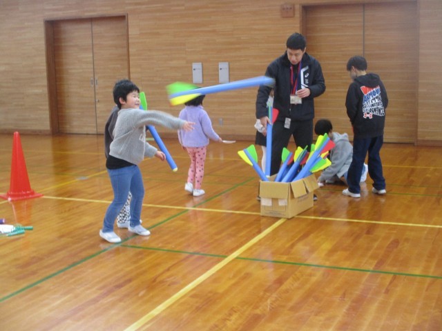 サッカーストラックアウト、野球のストラックアウト、ケンケンパー、ロケットとばし、紙鉄砲、縄跳びの6種目のコーナーがありました。全部クリアするべく、たくさん体を動かしていた1年生です。