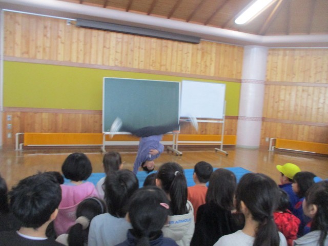 側転、ブリッジ、逆立ち、こま回しを披露し、たくさんの学年のお客さんから拍手をもらい、うれしそうにしていました。
