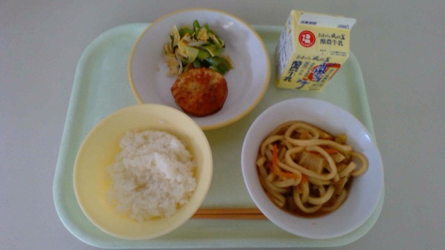 学校給食週間2日目は、「社会」です。豊臣秀吉にまつわる献立でした。みそ煮込みうどんは、秀吉の出身地である、愛知県の郷土料理で、赤味噌を使用しました。お好みソースは、大阪城を築いたことにちなんで、大阪府のソース文化を取り入れました。ゆば和えは、京都に大徳寺を建てたことから、京都の精進料理によく使われる湯葉を使用しました。今日もおいしくいただきました。