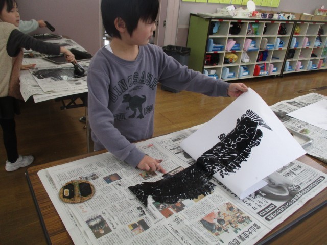 インクをつけて版画を刷ってみると「おお」「わあ」と自然と声が上がりました。