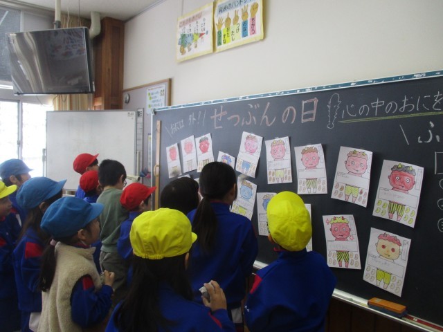「すぐイライラしてしまう鬼」「泣き虫の鬼」「面倒くさがりの鬼」など、自分の生活を振り返って心の中の鬼を想像しました。