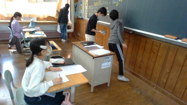家庭科「身の回りをきれいにしよう」の学習では、自分たちで学校の気になる場所を掃除したり、ごみを減らすことを伝えるポスターや資料を作ったりしています。一人一人が学んだことを生かして、自分なりの方法を選択し学習を進めています。
