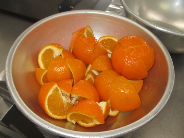 今日は、愛媛県産のいよかんが届きました。今が旬のおいしい果物です。ビタミンCが豊富なので、風邪予防にいいですよ。今日のいよかんは、6等分に切りました。全校で約280人分のいよかんが届きました。何個届いたでしょう?今日もおいしくいただきました。