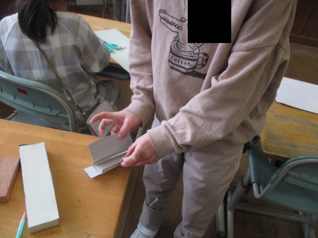 切り取った紙を操作しながら、「向かい合う面の形が同じじゃないと箱にならないよ」「辺の長さも関係しそうだ」と気付いたことを伝え合いました。