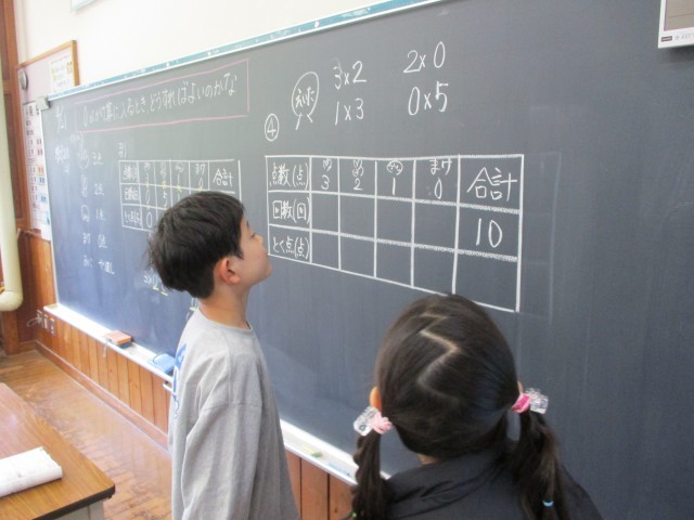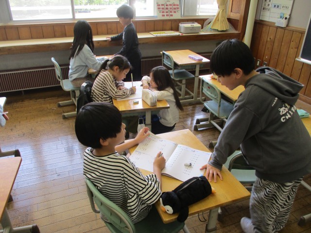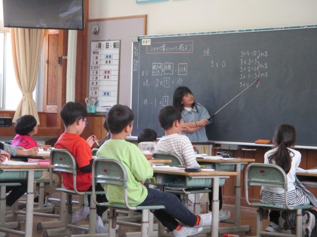 算数の学習では、かけ算の復習に取り組んでいます。友達と一緒に考えたり、教え合ったり、みんなの前で発表したりと、意欲的に学びに向かう姿がたくさん見られました。