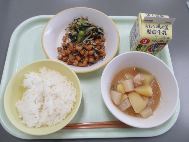 今日は、給食によく登場する「豆」料理でした。今日の豆は、「大豆」です。カリカリとしていて、嚙み応えもありました。小魚と一緒に食べるとカルシウム補給もばっちりですね。今日もおいしくいただきました。