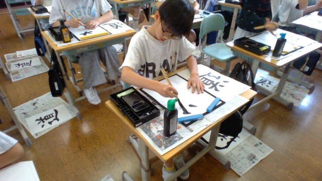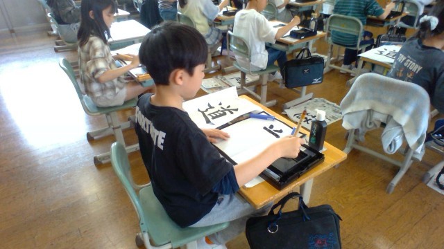 書写の時間では、毛筆で「道」の練習をしました。字のバランスやとめ、はらいなどを意識しながら書くことができました。