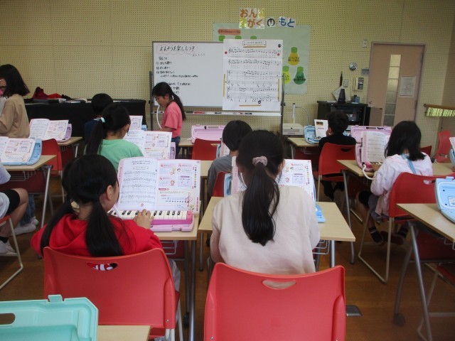 音楽科「いいことありそう」の学習では、リズムにのって歌ったり演奏したりする姿が見られました。
