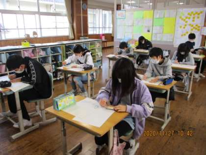 国語の「日本文化を発信しよう」という学習で、4、5年生に向けてパンフレットを作っています。今日の書写では、そのパンフレットを紹介するポスターを書きました。字の大きさや配列等を考えながら、思いを込めてポスターを書きました。1時間でしたが、集中して一生懸命書いていました。