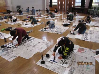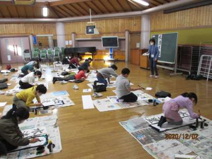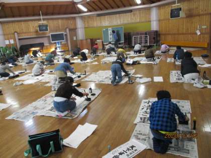 竜の子ホールの広い場所を利用して、書き初め練習をしています。校内書き初め大会に向けて、気合いが入ります。