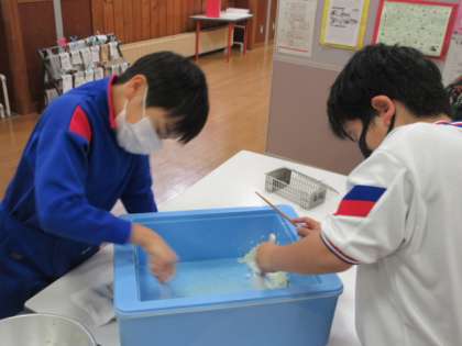 松組では、給食後に夢中になっていることがあります。それは、ご飯や味噌汁等を少しも無駄にしないことです。総合的な学習の時間で学んだことが活かされていると感じます。