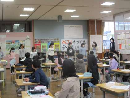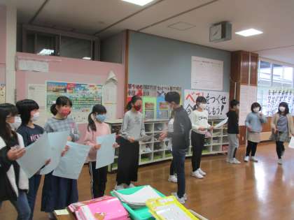 4年生が、パンフレットを読んだ感想を届けに来てくれました。手渡された感想を見て、照れながらも自分のがんばりがパンフレットを通して下級生に伝わっていることが分かり、うれしそうな6年生でした。