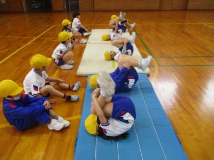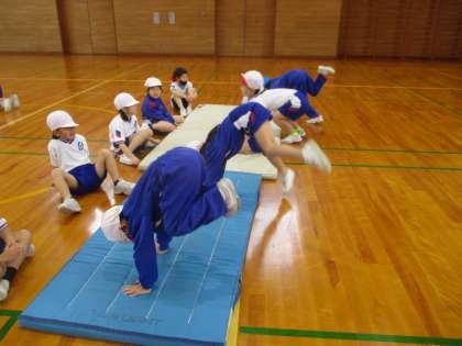 写真はゆりかご・かえるの足うちに挑戦している様子です。技ができるようになるためのコツを知ることで、少しずつ技がきれいになったり、楽にできるようになったりしています。友達のがんばりを見付ける姿もとてもすてきでした。