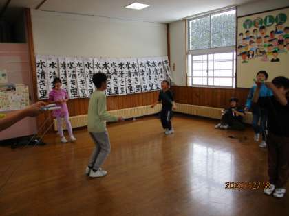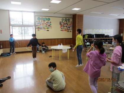 雨や雪の日でも、休憩時間に屋内で楽しく友達と遊んでいます。二重跳びの競争や、将棋、読書等、楽しみを自分たちで見付けています。