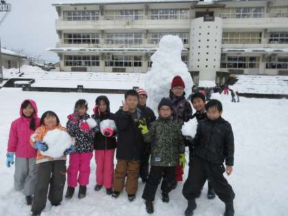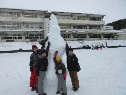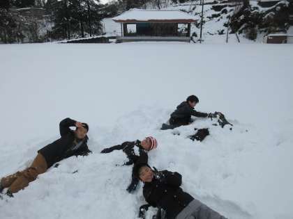 雪のタワーを作ったり、雪で涼んだりしている子供たちの様子です。