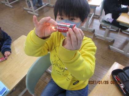 豆電球、乾電池、導線1本だけで、明かりをつけました。「たったこれだけで明かりがつくの?」といぶかしげにしていた子供たちですが、明かりがついた瞬間、大盛り上がりでした。