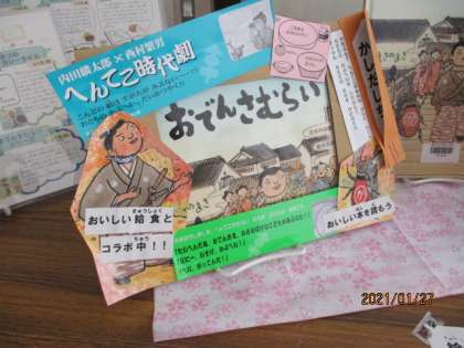 今週は、給食週間「本の世界を味わおう」というテーマで、毎日わくわくするような給食の献立になっています。図書室前にも、給食の献立に関する本の紹介がされていて、今日は「おでんさむらい」を味わいました!