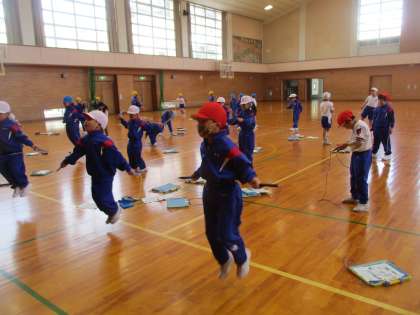 1年生は、体育の時間に、いろいろな縄跳びの技に挑戦しています。前跳び、後ろ跳び、駆け足跳びは、跳ぶ回数を増やすことをがんばっています。そのほかにも、あや跳び、交差跳び、二重跳び等の技にも挑戦しています。