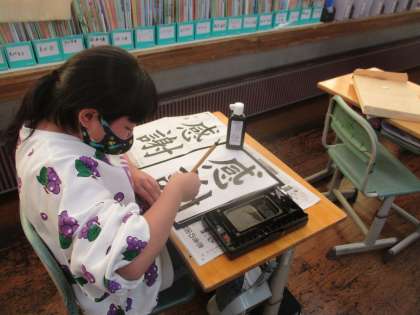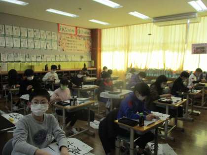 6年生の卒業プロジェクトのテーマでもある「感謝」に挑戦です。画数も多く、バランスよく書くことがとても難しいですが、集中して1枚を書きました。学習発表会の際に、ぜひご覧下さい。