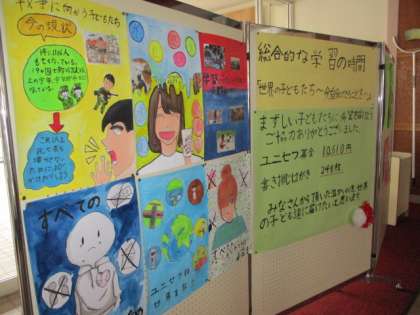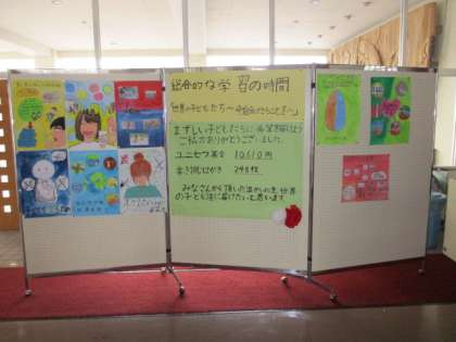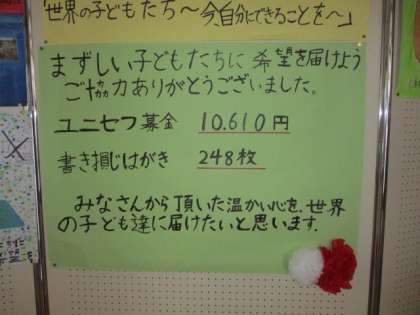 児童玄関にて、ユニセフ募金、書き損じハガキの集計のお知らせをしています。たくさんの方にご協力いただきました。本当にありがとうございます。2月19日には、書き損じハガキの贈呈式も予定しています。5年生の子供たちの思いと、みなさんの善意を届けたいと思います。
