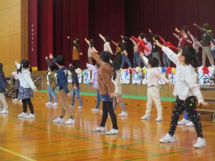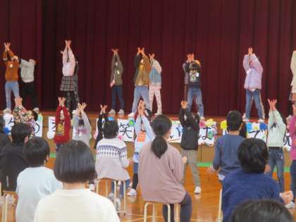 卒業を祝う会で1年生は、「鬼滅の刃」の「紅蓮華」に合わせて、ダンスを踊りました。曲に合わせて、会場が一体となって手拍子をしてくれました。1年生の一生懸命踊る姿に、6年生から「かっこいい!」「かわいい!」という声があがりました。