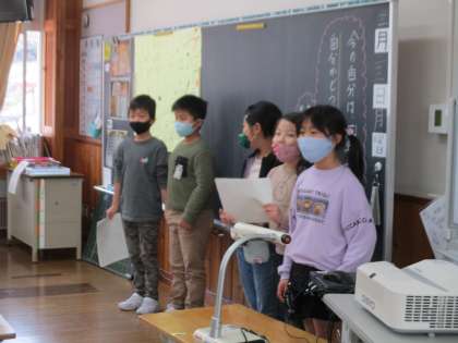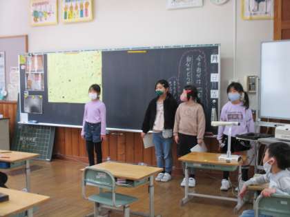 写真は、司会係、初めの言葉担当、「オニあてゲーム」担当の子供たちの様子です。