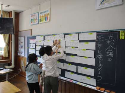 みんなで納得いくまで話し合い、考え合い・・・、最後には、2つの案に集約されました。みんなの意見がぎゅっとつまった2つの目標。どちらか多数決で決めるのではなく、ちょっと遠くにある大きな目標は「学年目標」、毎日振り返りたい目標は「学級目標」にすることになりました。ぜひ、お家でお子さんに聞いてみてください。