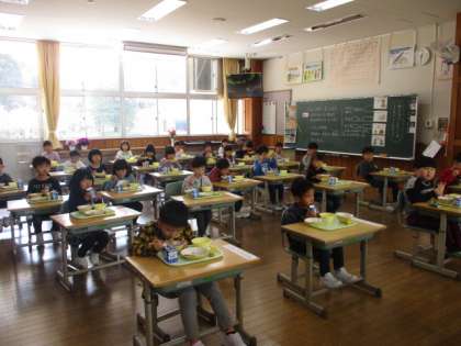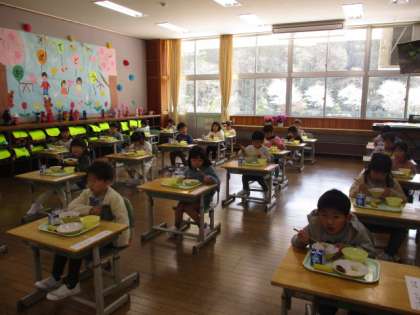 今日は小学校で初めて給食を食べる日でした。両手でしっかりお盆を持って、丁寧に運ぶことができました。静かに待つ、静かに食べるという約束も上手に守ることができました。