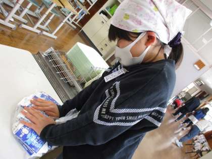 さらに、みんなの牛乳パックをなんとか整えて、小さくまとめて出すことで調理員さんに喜んでもらおうと、「牛乳袋圧縮係」が発足しました。これからの活躍が楽しみです。