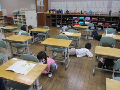 全員がふきのとうになって、雪をどけようとふんばっているところです。「よいしょ、よいしょ、おもたいな。」と、小さな声も聞こえてきます。