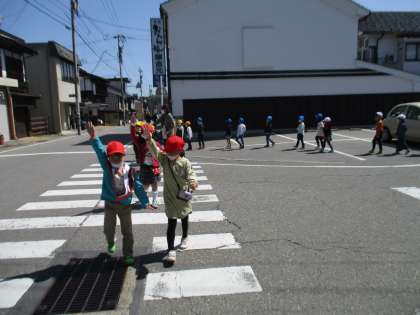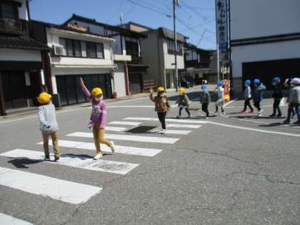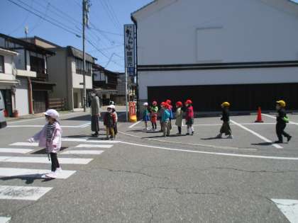 1・2年生は児童玄関前で、安全な道路横断の仕方等について警察署の方のお話を聞いた後、実際に学校近辺の道路を歩いてみました。当日は、保護者の方もボランティアとしてコース上のポイントに立ってくださいました。「止まって確認」「自動車の音を聞く」「素早くわたる」など、子供たちが、教わったことを守って横断しようとする姿がとてもよかったです。