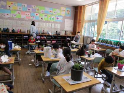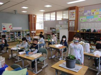 今日は、子供たちが楽しみにしていた、野菜の苗を植え替える活動をしました。植える前に苗を観察してみました。「はっぱが2種類あるよ!」「さわってみたらふわふわだった」「よく見たら毛が生えてる!」「下から見たら、根っこが出ているよ」と口々に気付いたことを発表しました。新たな発見がたくさんありましたね。