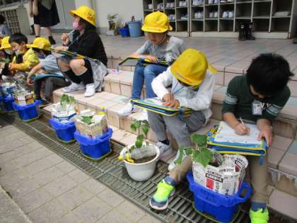 植えた苗をじっくりと観察しました。「茎がチクチクしている」「葉っぱがざらざらしているよ」など、たくさんの発見がありました。これから野菜の成長が楽しみですね。