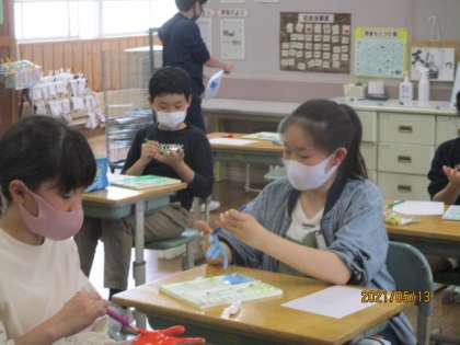 6時間目に学級目標に掲示する手形をつくりました。筆を使って手に色を塗ることを楽しんでました。