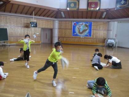 今日は紙鉄砲を作って、楽しみました。体育のボール投げにも生かせるのですが、手のスナップのかけ方やフォームに気を付けるとよい音がします。家でも練習してみると楽しいですね。