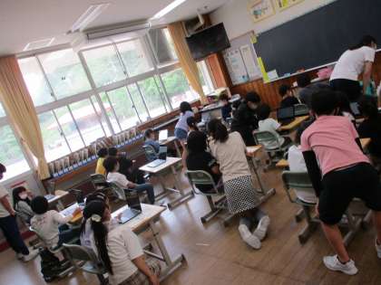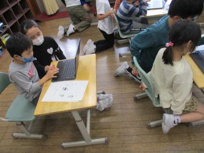 2年生さんの教室へ行き、クロムブックの学習のサポートをしてきました。2か月前に設定のお手伝いをして以来です。前回の交流の時よりも、目線を合わせて話したり、画面を自分で操作させてあげたりする姿が増えていて、とても頼もしかったです。