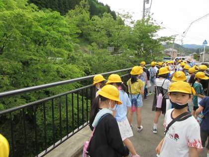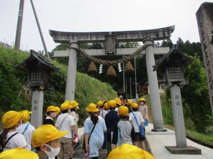 地図作りのために、学校横の別荘川にかかる橋を渡って、上笹原方面を歩きました。広々とした水田や畑が広がっていました。石動神社では、「鳥居」をくぐり、神社の地図記号のもとになった形を確認しました。