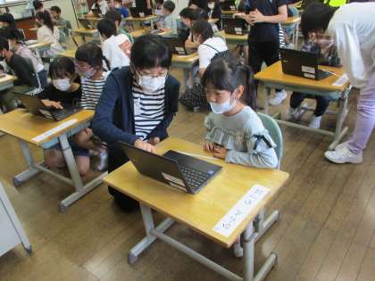 6年生が、初めてクロムブックを使う1年生のお手伝いに行きました。パスワードや生活調査アンケートの入力の仕方を教えたり、クロムブックの片付けの仕方を教えたりしました。1年生が頼ってくれていることが嬉しい6年生と、お兄さんお姉さんが手伝ってくれることに安心している1年生の姿に、心がほっこりしました。