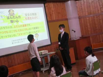 富山市教育センターから講師の先生をお迎えして、情報モラルについて教えていただきました。始めの言葉を担当したNさんは、家でタブレットを使っていて困った経験を振り返り、目当てを語りました。