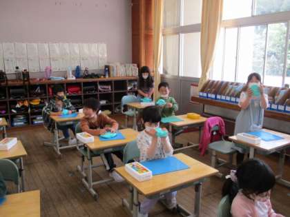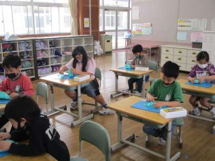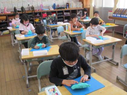 図工で久しぶりに粘土をしました。今回の学習は、粘土をぎゅっとにぎりしめて偶然できた形から思いついたものをつくる活動です。粘土をにぎる感触を楽しんだり、できた形から想像を膨らませて夢中になって作品づくりをしたりして、あっという間に時間が過ぎました。